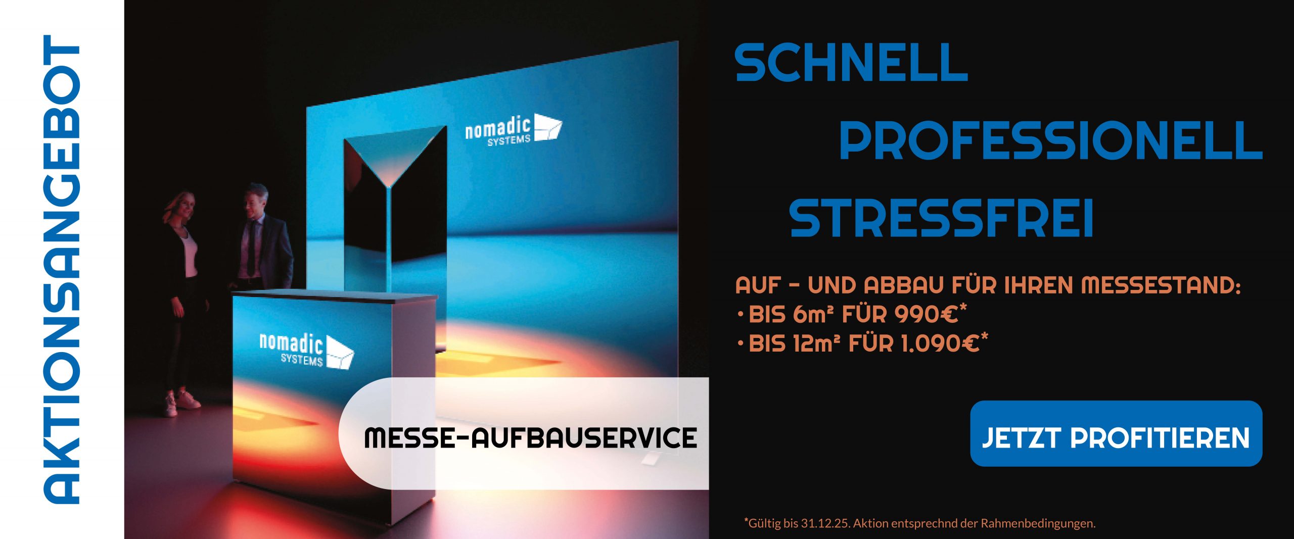 Seit 1996 ist Nomadic Systems der kompetente Ansprechpartner für Aussteller und Eventmanager, die sich gekonnt in Szene setzen möchten. Bei uns bekommen Sie mehr als nur ein mobiles Faltdisplay oder einen modularen Messestand. Denn unsere Mission ist es, unseren Kunden konkurrenzlos intelligente Produkte und einen erstklassigen Service vor und nach dem Kauf zu bieten. Für Sie bedeutet das die Gewissheit, innovative Display- und Pop-Up-Systeme in Verbindung mit einzigartigen Serviceleistungen zu erhalten. Vom weltweiten Auf- und Abbau über die komplette Logistik bis hin zum Reparatur- und Einlagerungsservice.